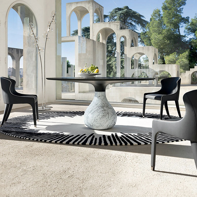 Description: The design is inspired by the shape of a drop of water when it touches an object. The base of the AQUA dining table is based on Carrare marble and the table top is made of the innovative material Fenix NTM, which combines aesthetics and cutting-edge technical performance. The tabletop material has a silky touch and fingerprint resistance, can withstand scratches, abrasions, and dryness, has antibacterial properties, is waterproof and mildew-resistant, and is easy to clean. The tabletop can be repaired with a damp cloth and iron according to the maintenance instructions.