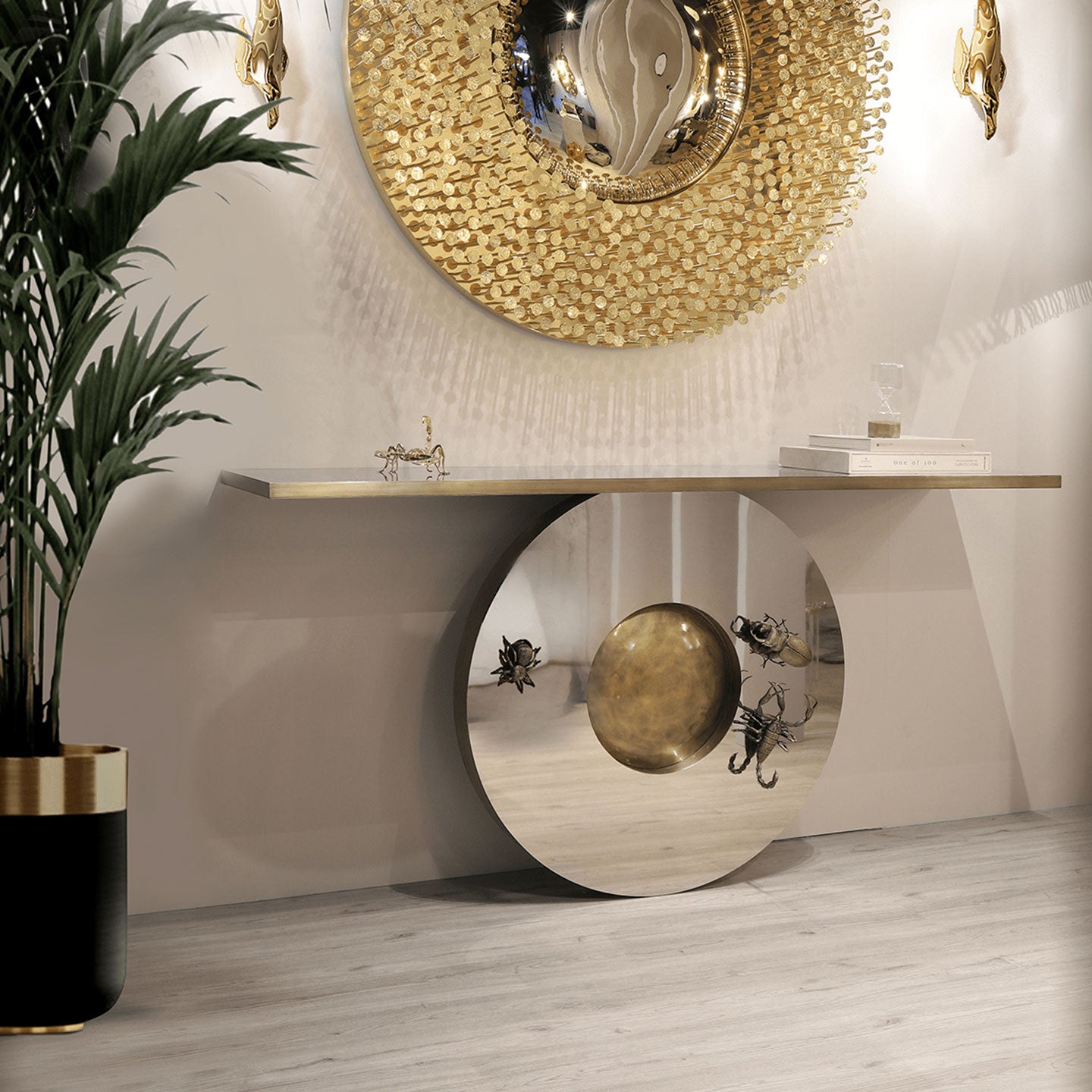 The Metamorphosis Console is composed by a top and base finished in polished inox and brass beautified by the presence of golden creatures. Two brass plated feet with casted brass details.