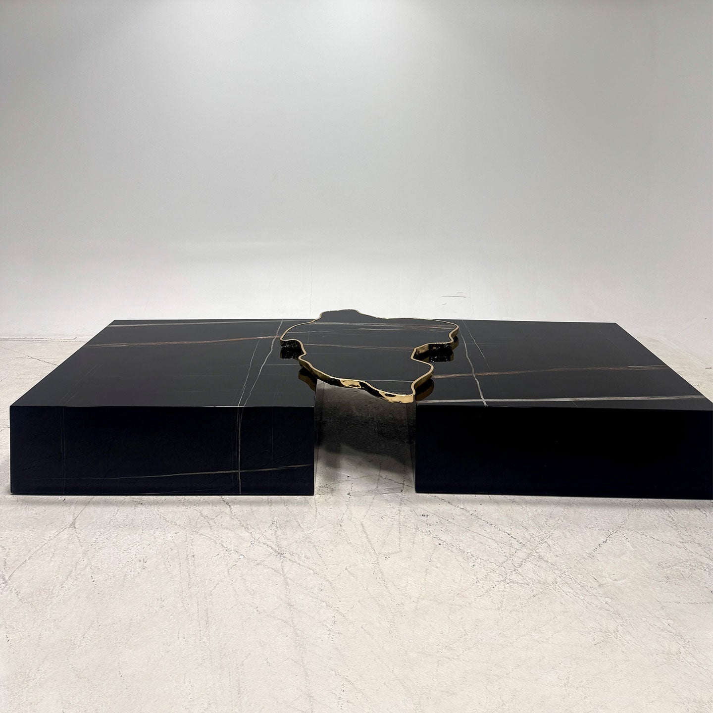 A contemporary center table composed by two square marble modules, linked by an organic marble surface element on top enveloped by casted brass.