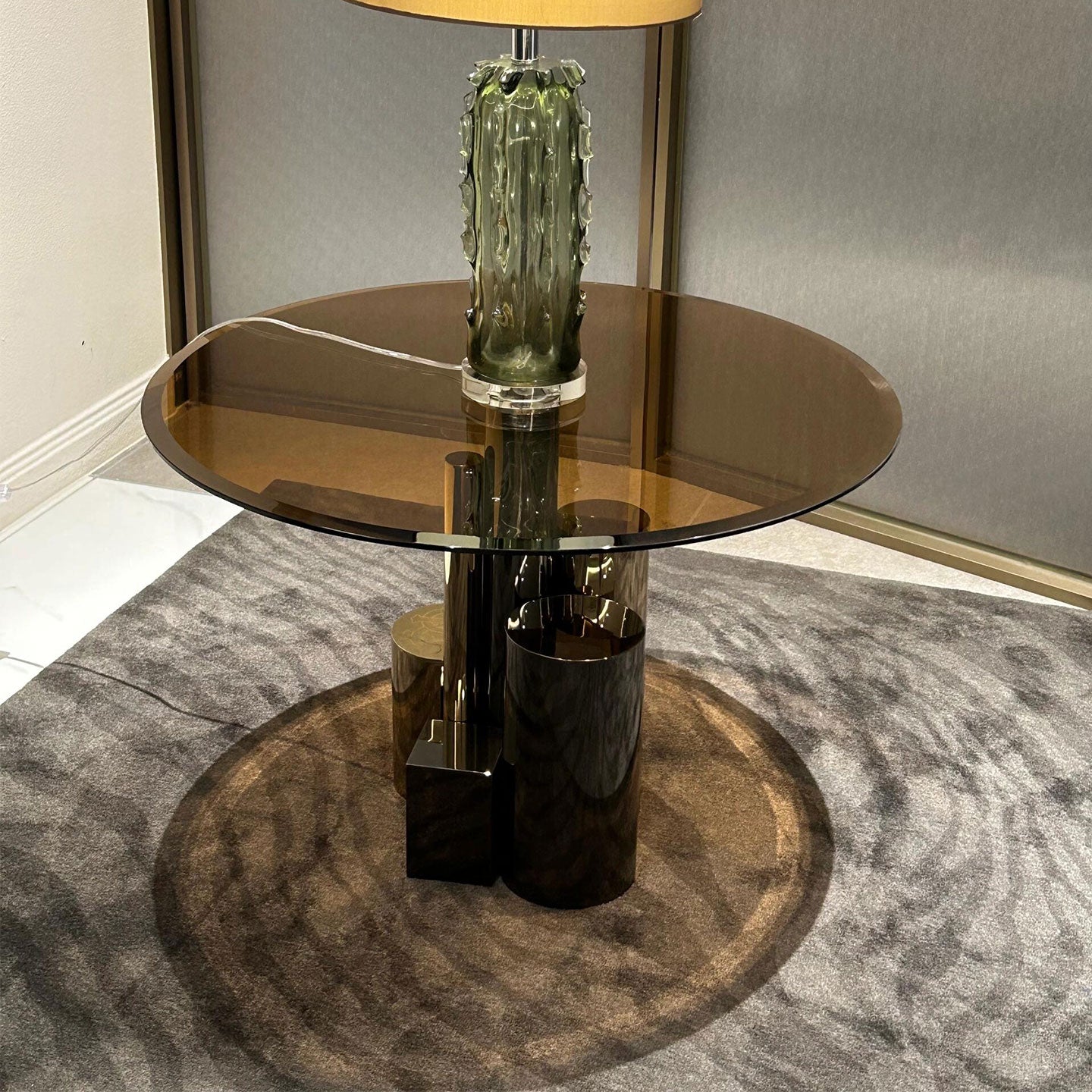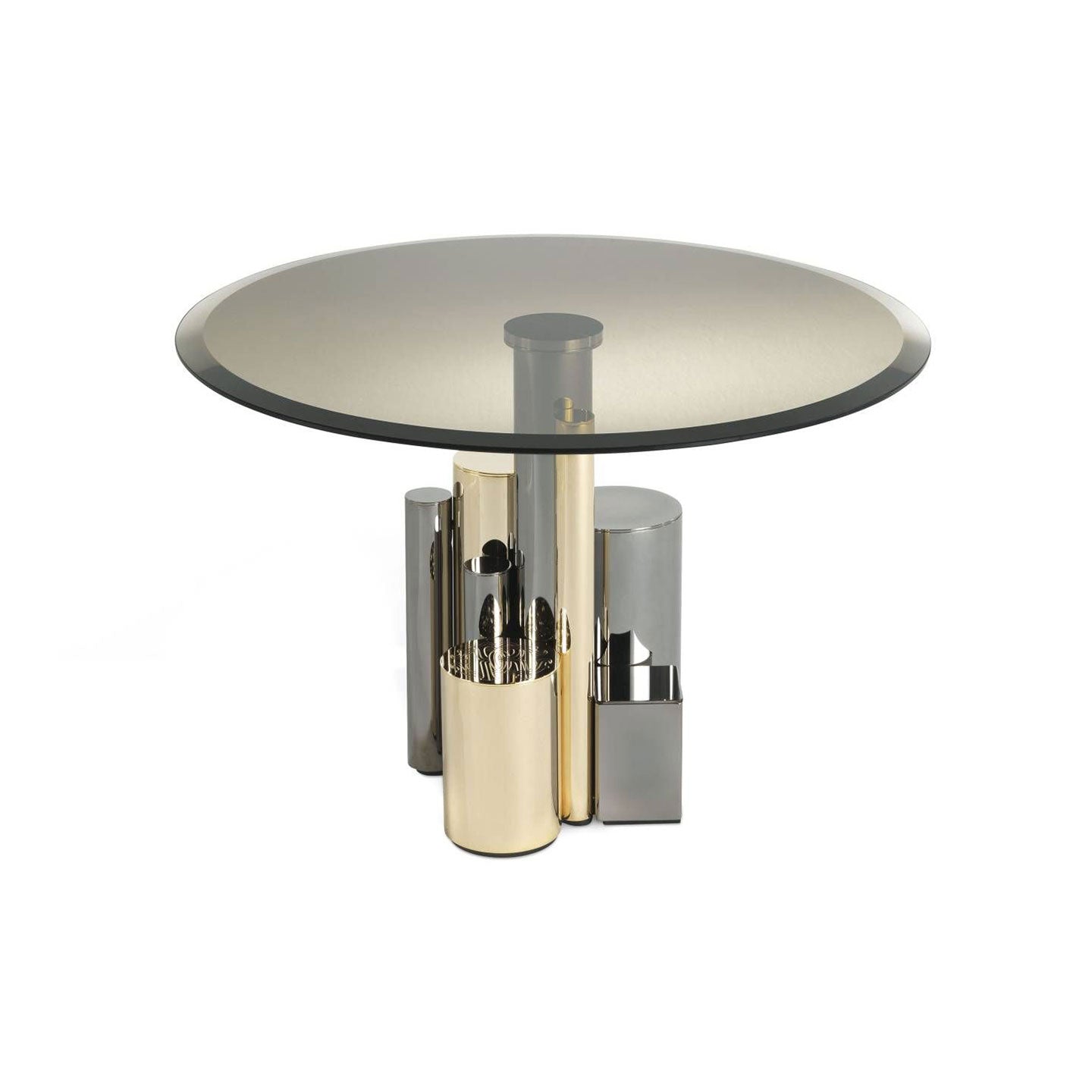 Contemporary lines and precious materials for the Antigua low table. The base is a sculptural composition consisting of metal elements with different thicknesses, heights and finishes, that shine through the smoked glass top to give life to a striking piece, able to enhance the living room with its charm.