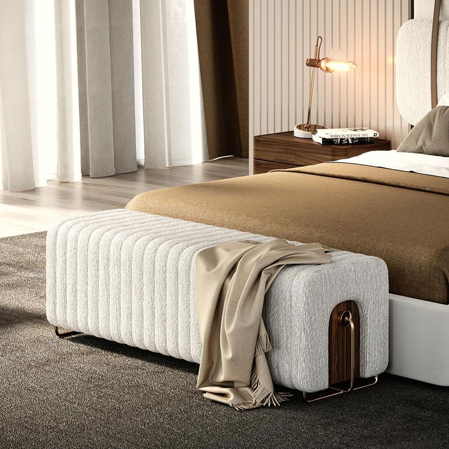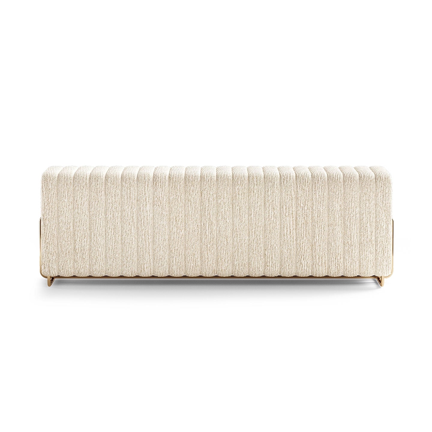 The Rivers bench gathers its inspiration from the bold elegance of the '60s. The alluring pattern, featuring parallel vertical seams, combined with the sophisticated brass feet, dancing gracefully below the seat, gives the design a unique style, perfect to complement any mid-century modern bedroom.