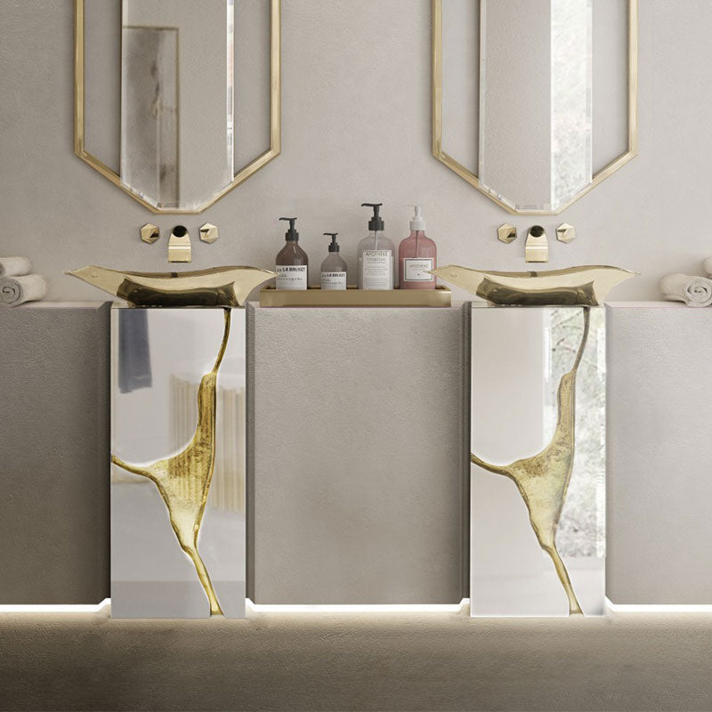 The Lapiaz washbasin, designed by Tingyuan, embodies a striking Italian luxury style, inspired by the natural erosion of limestone and dolomite, known as karst landforms. Resembling a cracked stone, this sculptural piece of art exudes a rich golden sheen, exuding both cool elegance and warm sophistication.
