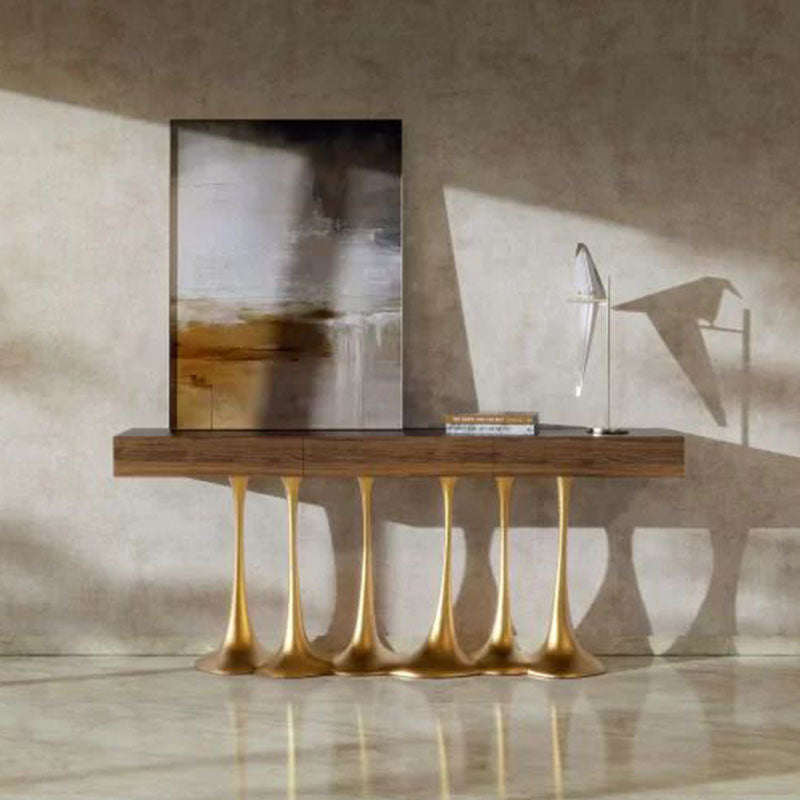Striking the perfect balance between elegance and function, the Janus console features a high-gloss black textured top and a sculptural gold leaf base. Its organic shapes evoke a fluid, natural movement, becoming a strong and sophisticated focal point. With three discreet drawers for storage, it offers practicality without sacrificing design. Ideal for high-end interiors, this piece adds a distinctive touch of exclusivity and refinement to any space.