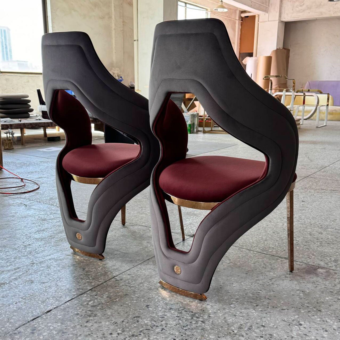 This grey streamlined art dining chair is known for its bold, sculptural design. Its flowing S-curves and openwork design make it resemble a sitable piece of modern art. The high-quality grey velvet fabric is soft and luxurious to the touch, paired with shimmering gold metal legs and a base, creating an overall effect that is light and airy yet visually striking.