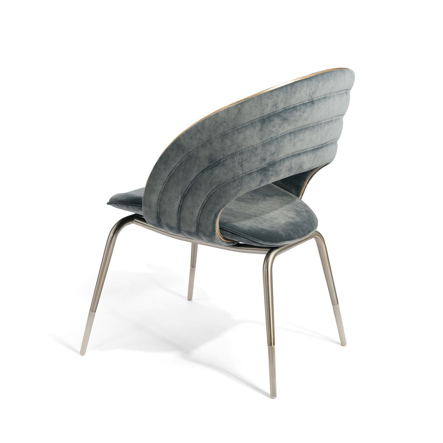 Featuring a plush dusty blue velvet upholstery with distinctive horizontal channel tufting on the curved backrest, this chair offers both visual texture and exceptional seating comfort. The sleek champagne gold / brushed nickel metal frame with slim legs creates a perfect contrast, giving the chair a light, airy, and sophisticated silhouette.
