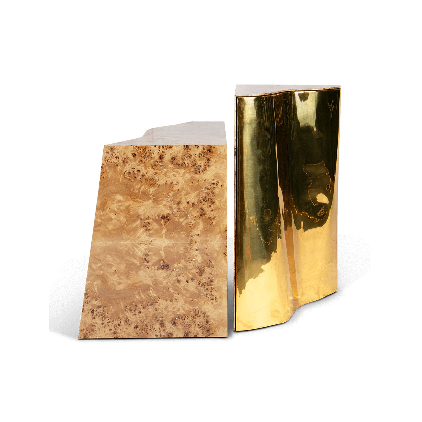 Lapiaz side table takes exceptional craftsmanship and design to a new realm. Its organic feature are achieved through the manual fitting of the polished brass sheet, and a warmth glossy poplar root veneer finish. The hammered brass details and the wood veneer convey both dynamics and elegance to bring a new contemporary verve into refined interiors.