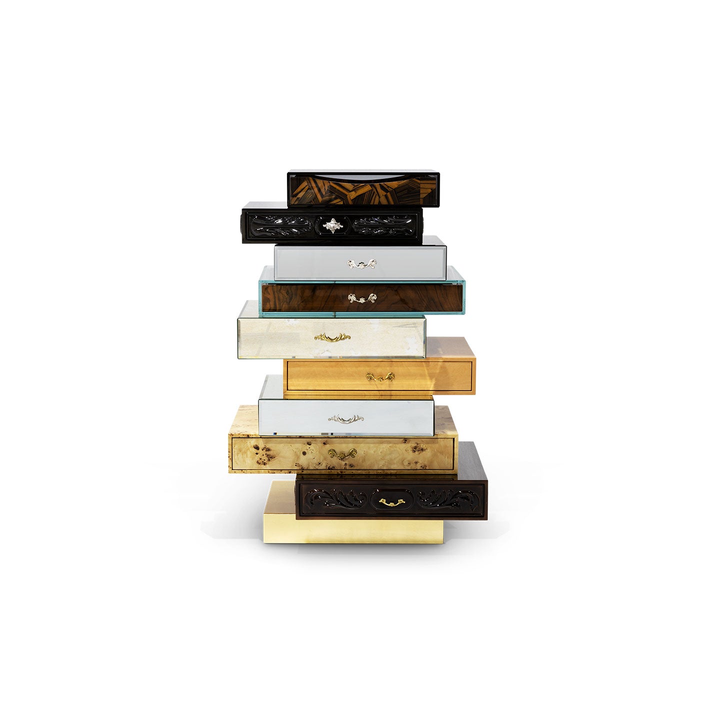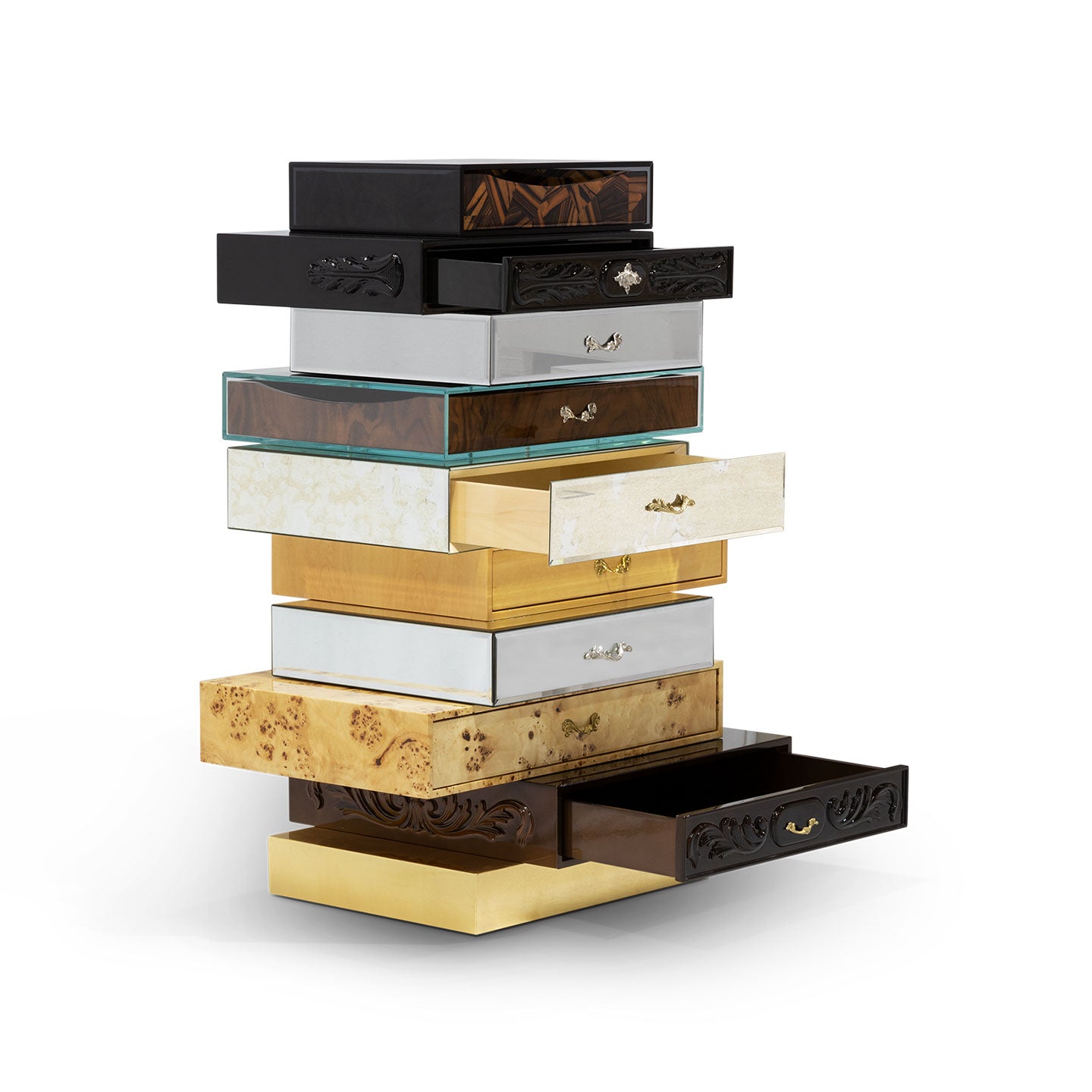 Each of its nine drawers features a different style to convey this piece a unique character of the collectible design. The styles vary with each step taken, and finishes include from walnut veneer to beveled smoked mirror, or detailed hand carved wood and copper leaf, being each drawer depicted different handcrafted polished brass pulls.