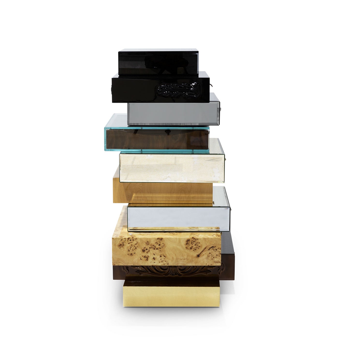 Ebony geometric mosaic veneer finished in a matte varnish and encased in a smoked glass box. (2) Hand carved wood finished in a high gloss black lacquer. (3) Beveled smoked mirror over wood. (4) Walnut veneer finished with a high gloss varnish and encased in a tempered translucent glass box. (5) Antiqued beveled mirror over wood. (6) Birds eye maple wood veneer finished in a high gloss varnish. (7) Beveled mirror over wood. (8) Burl wood veneer finished with a high gloss varnish. (9) Hand carved wood coated with cooper leaf finished with a translucent black high gloss varnish. Base: Gold leaf finished in a high gloss varnish.
